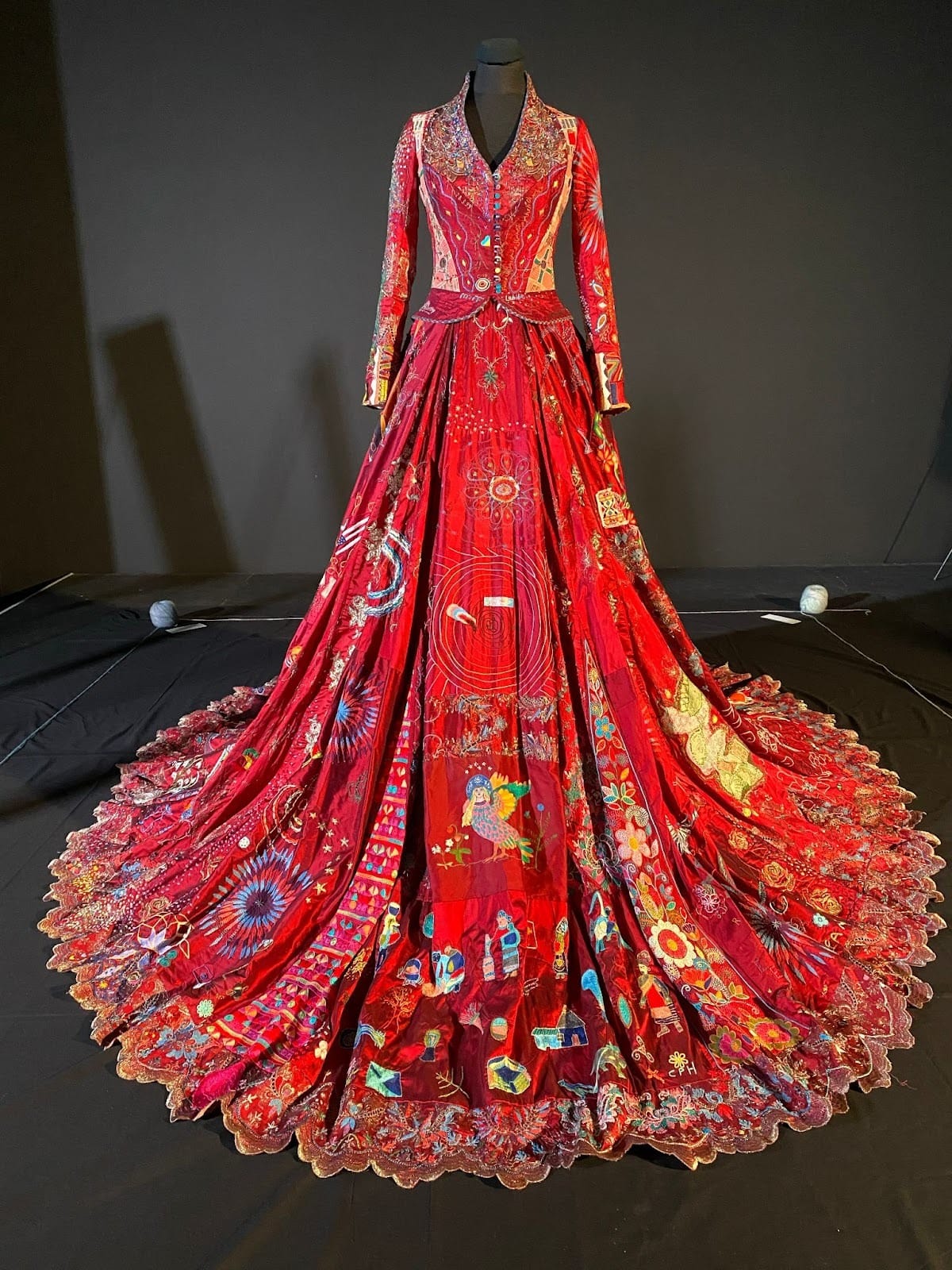 The Red Dress Project is the largest collaborative embroidery project in the world. 367 women, 11 men and 2 non-binary artists from 51 countries. Refugees from Palestine, Syria and Ukraine, women seeking asylum in the UK from Iran, Iraq, China, Nigeria and Namibia, survivors from Kosovo, Bosnia and Herzegovina, Rwanda and DR Congo. Cultures fragmented by war. The dress is a vehicle for sharing of stories. A capsule of knowledge arrested in transition by the loss of individual lives and the dislocation of communities. A document of astonishing technical skill, an embodiment of their culture, eyes that know able to identify a region by the pattern of their stitches. Each patch added to the Dress a contribution to a conversation through materials that transcends language.