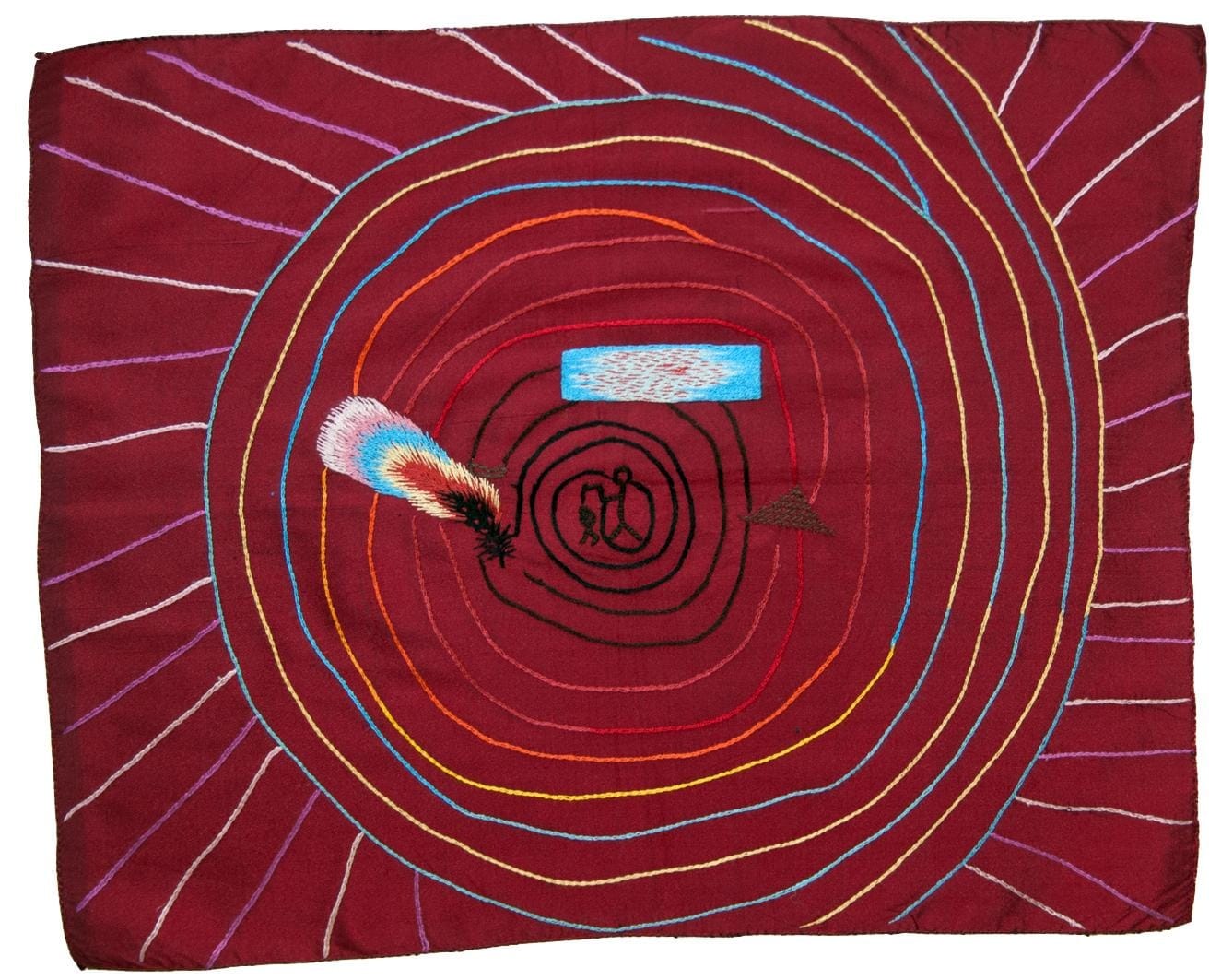 Kirstie tells us about a group from Kigali, Rwanda. Six women who have all lived through a genocide and lost friends, family, children. This project was the first time they sewed together. The intermediary is worried that the work isn’t right for the Red Dress, it doesn’t show off their technical prowess but the women are insistent that this is the piece they want to contribute. The patch arrives. Deliberately crude. Deceptively simple. A stick figure, one of the most basic figurative representations of a human being we have, tightly bound in a claustrophobic black spiral but as the threads move out they shift into colour and space and become a sun radiating out light. A document of their journey. A map for others.