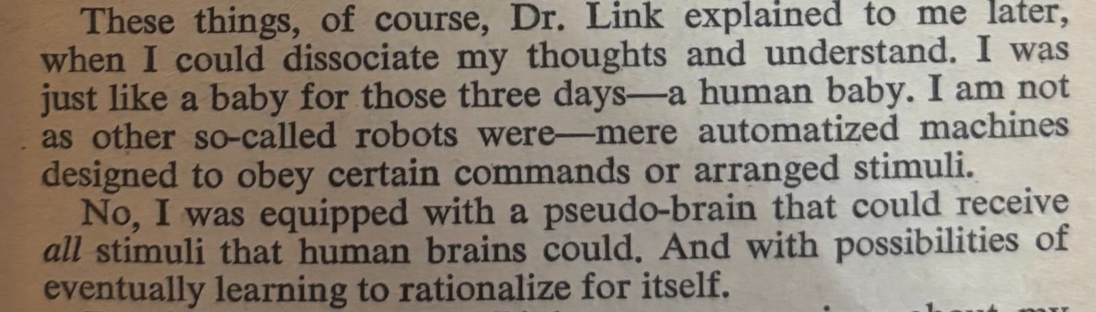 Asimov’s mechanical men had positronic brains. Neither imagined anything of computer programming, rather a human brain cast in platinum-iridium. A kind of alchemy. Which, it seems to me, fit with the protoplasmic stamping hinted in R.U.R. or Rossum’s Universal Robots. A dreary tale, where man’s idleness in the face of an inexhaustible work force basically loses them the favour of God, allowing the robot to inherit the Earth.