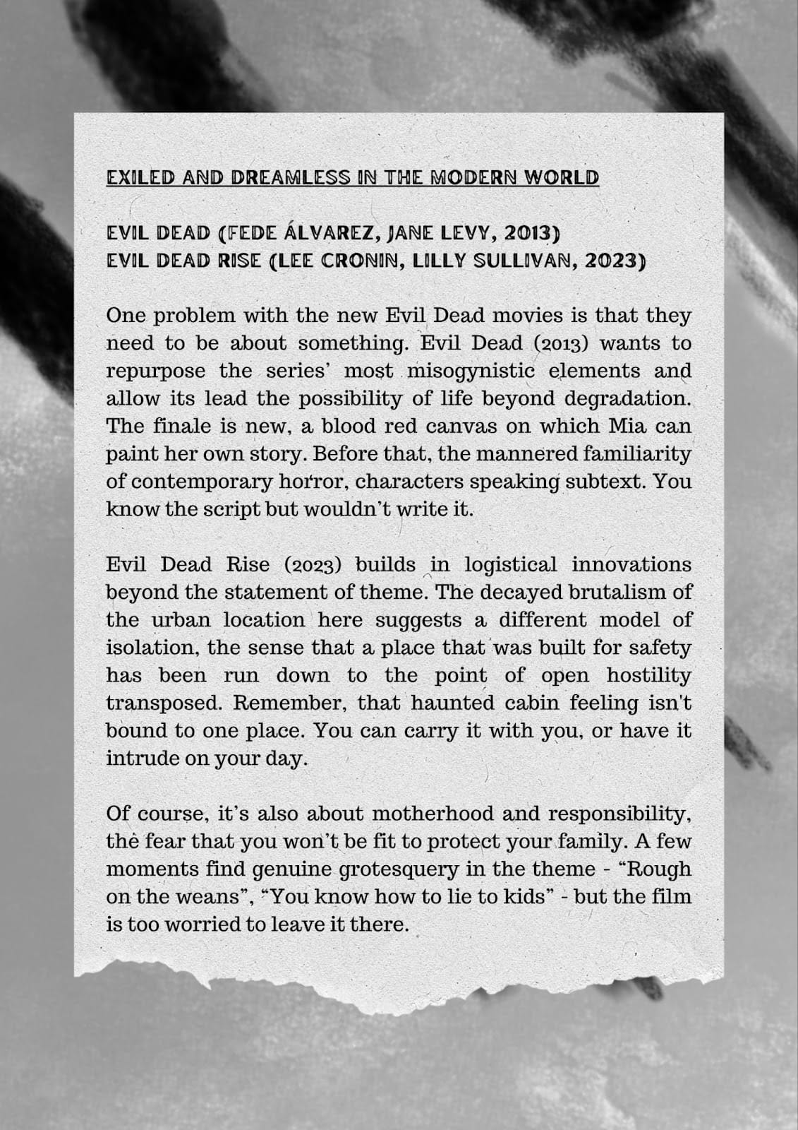 The Vile Dead 5: Evil Dead (Fede Álvarez, Jane Levy, 2013); Evil Dead Rise (Lee Cronin, Lilly Sullivan, 2023)