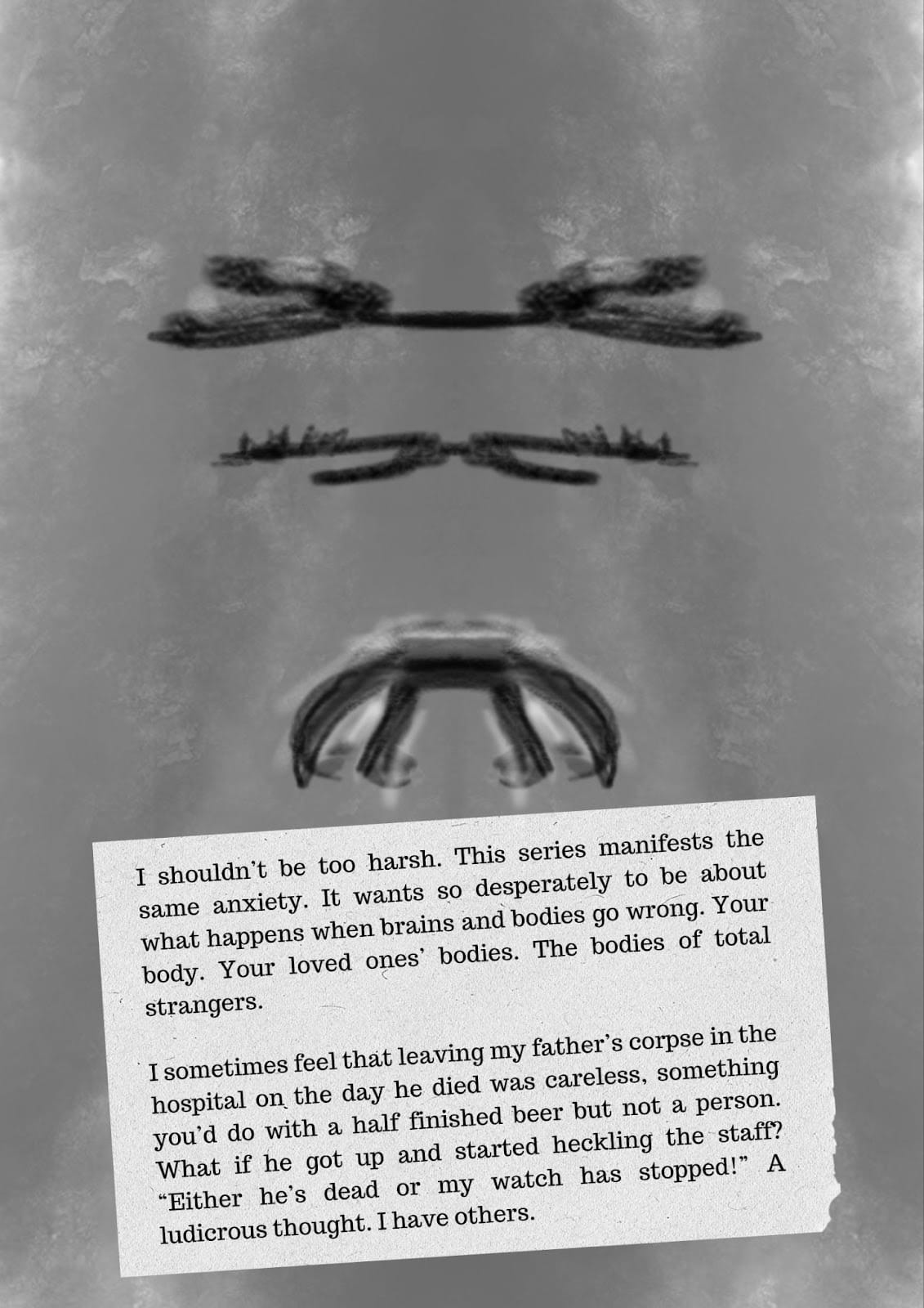 I hate the cheery game show binary of Team Believer and Team Sceptic. Asking if ghosts have the same ontological status as giraffes. The reality of ghosts is there, on the thresholds, in the ruptures and the loops we all experience. I’m not sure I can become a ghost but I think my ghost can happen to others. But, anyway, when we die I’m really going to miss you.