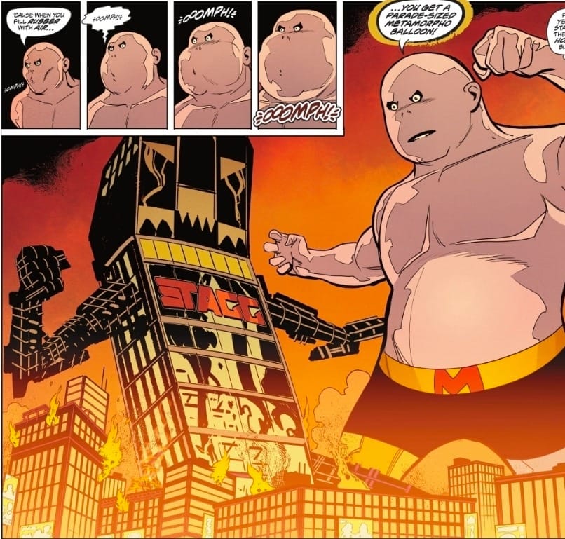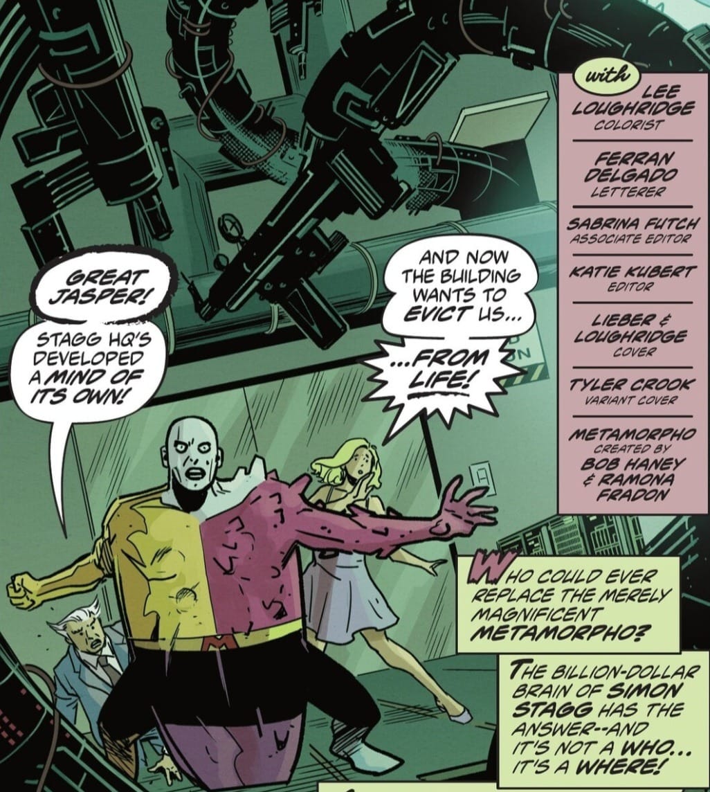 There’s also a counter-story built into this exchange between Metamorpho and Sapphire though. The idea that the building, rather than those who own it, wants to evict you… does that pass the smell test? It doesn’t in Metamorpho #4, where this scene turns out to be the result of luxury class panic: the building is too “opulent” to evacuate so it’s been programmed to evacuate itself in the face of catastrophe. The feeling Ewing and Leiber catch here, of living in a hostile construct we thought was our home… that’s pure comic book poetry, an eerie feeling made vulnerable through the gift of humanoid form.