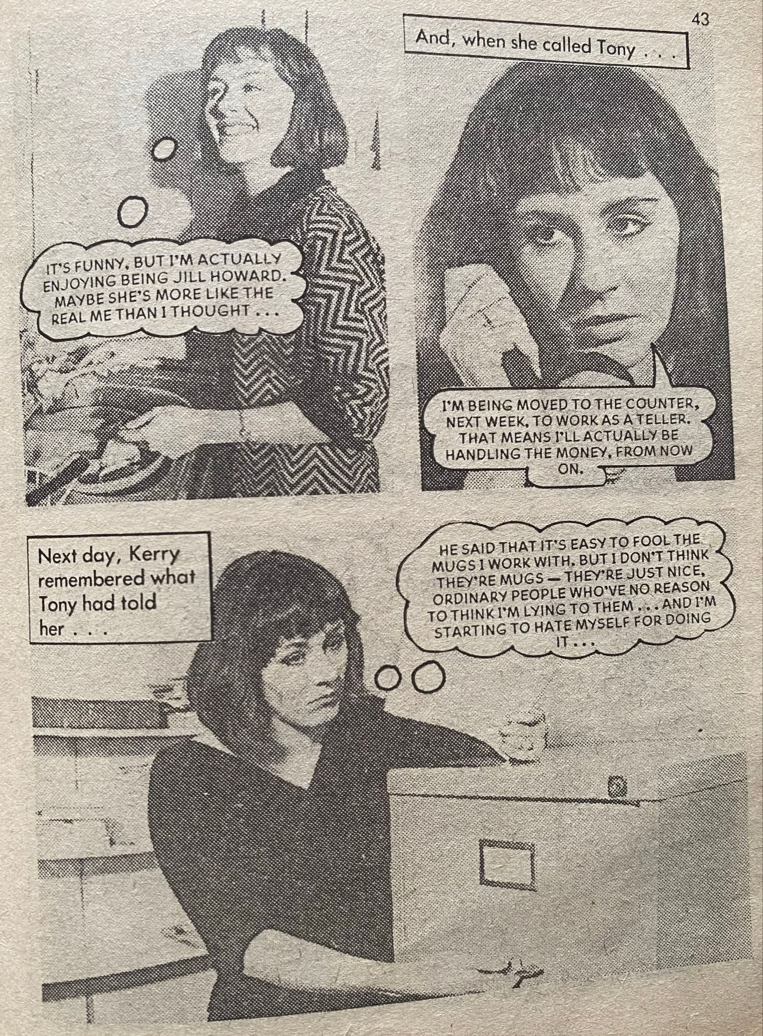 Freed of constant parental arguments, freed from the adrenaline spiking excitement of her forbidden bad lad, in proximity to the possibility of female friendship, Kelly starts to relax into Jill, to enjoy being her. And starts to fall for Tory success story assistant manager Alan.