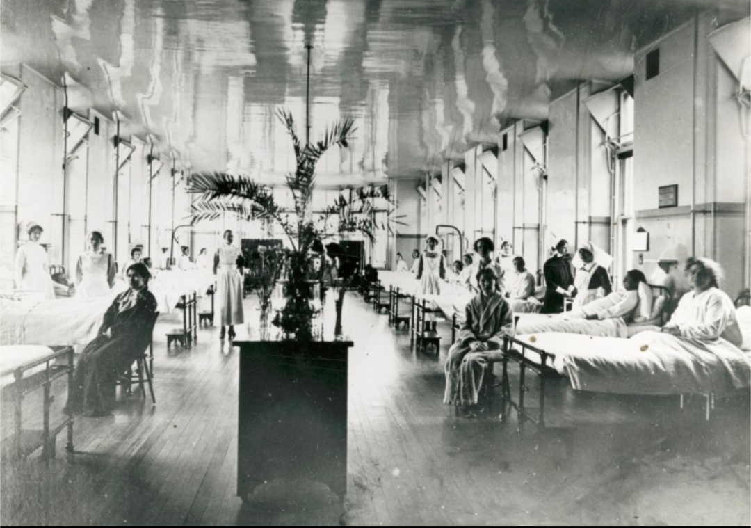 Inside is dark twice over, blackened by a fire the year before. Center stage a charred bed frame catches light from a hole in the ceiling. I picture twisted, thrashing bodies turned to dust while nurses dance to an arsonist’s spell.