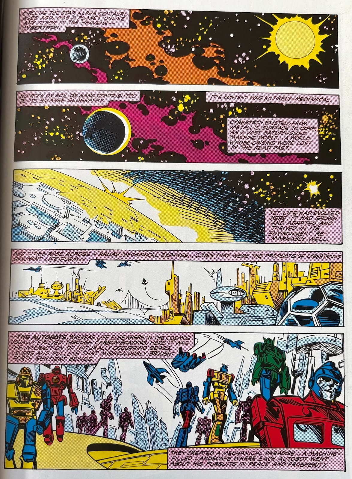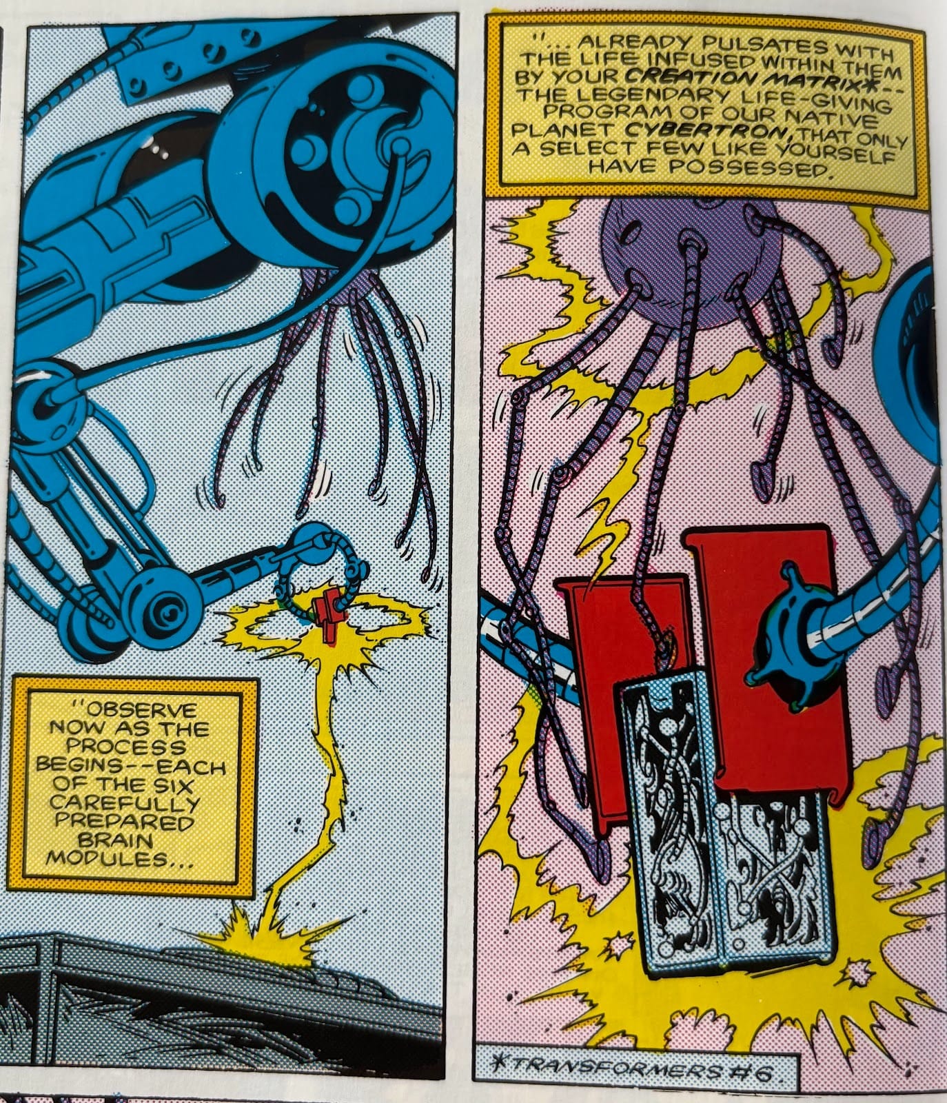There were earlier ideas, wrapped up, transformed or abandoned. The first page of the original limited series tells us of a world of ‘naturally occurring gears, leavers and pulleys’. With the series conversion to an ongoing, the concept of the Creation Matrix arrived. A computer program passed down that could create Cybertronian life in a provided body. The cartoon initially gave no such considerations, before backpedaling and adding it’s own personality wellspring, the computer Vector Sigma.