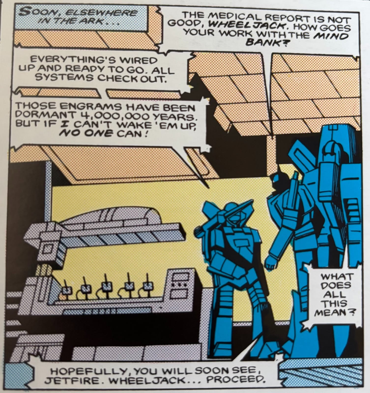 It begins with some nonsense. Fixing the Autobots on the casualty list is too much of an ask, but they’ve thrown together five new guys to bolster the roster. Rather than matrix them, stored copies of their minds were brought aboard ship before they left home. Copies. Never mind the future revelation that one Transformer brain can be saved on a five and a quarter floppy, an absolutely fascinating opportunity is created and never followed through. Does a society of sentient machines draw any lines on the subject of personal replication?