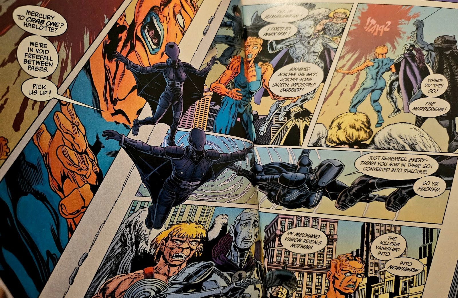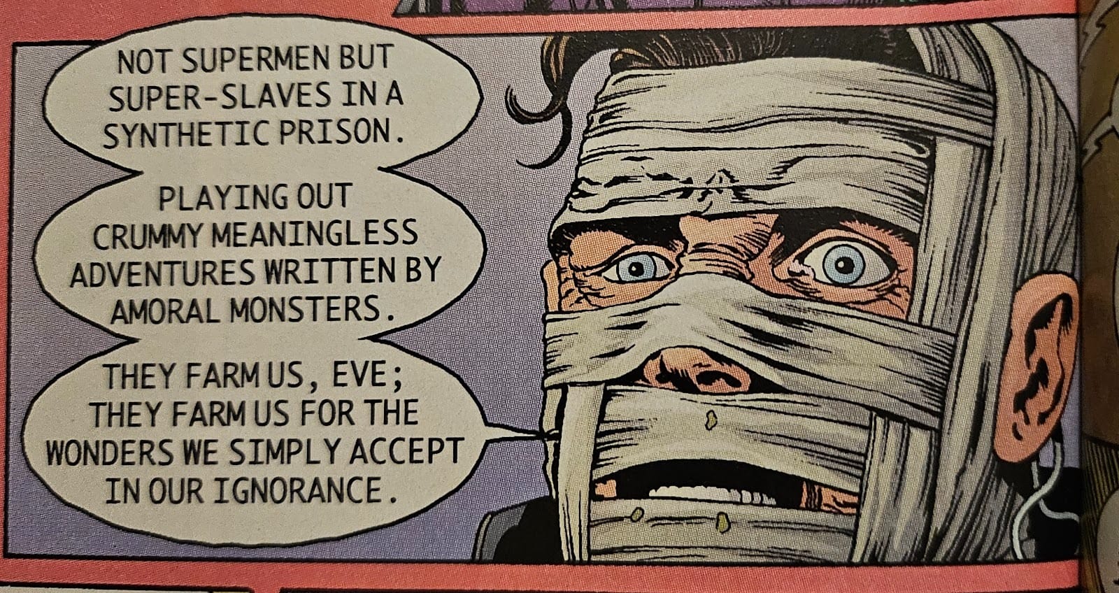 As a strange side-effect, a handful of comics that used pop fiction as a vehicle for occult exploration ended up looking like something Blake might have written while looking at coffins on a soot-stained production line. Well-worn metafiction recast as an eerie intimation of life in a world that can change overnight depending on the needs of certain spreadsheets.