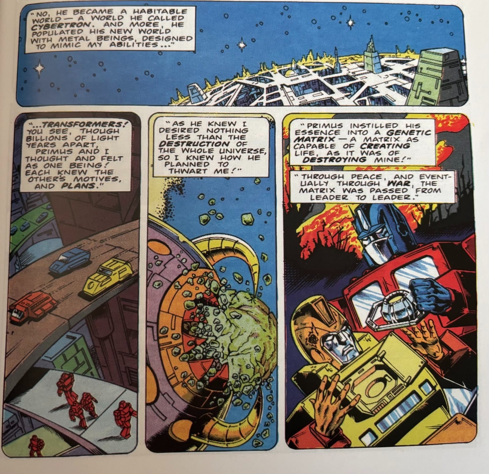 The Legacy of Unicron was an iconic story of the UK Transformers comic. Cybertron, planet of the Transformers, was now a god called Primus. A metal biome, the children of his quicksilver flesh being the warring race we plucked the members of from the toy shelves.